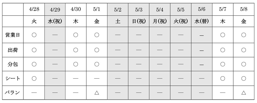 【お知らせ】ゴールデンウィーク出荷のご案内